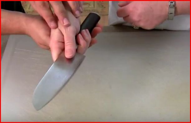 Ο αντίχειρας από τη μια μεριά, ο δείκτης από την άλλη, “τσιμπούν” τη λάμα και το χέρι αποκτά μεγαλύτερο έλεγχο στο μαχαίρι και το κόψιμο γίνεται πιο ασφαλές.