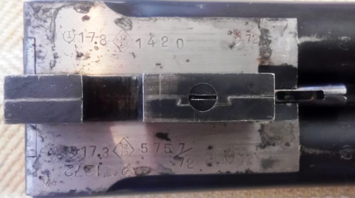 Στη φωτογραφία διακρίνονται οι σφραγίδες δοκιμής της Ουγγρικής Τράπεζας Δοκιμών στα 900 bar, το μήκος θαλάμης 70 χιλιοστών, το διαμέτρημα 12, και η χρονολογία κατασκευής 1972. Τα τσοκαρίσματα, δηλαδή η διάμετροι των στομίων είναι 17,8 και 17,3, που δείχνουν ντεμί και φουλ.