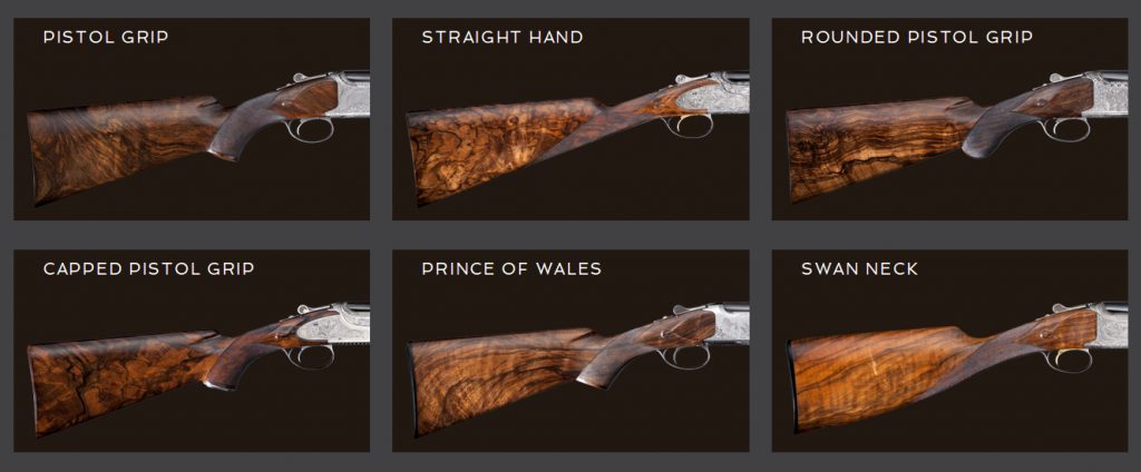 Το κοντάκι “λαιμός κύκνου” προσπαθεί να κατεβάσει με ένα σμπάρο δυό τρυγόνια: να έχει την λιτή σιλουέτα του αγγλέ και ταυτόχρονα τον έλεγχο του ντεμί πιστολέ.