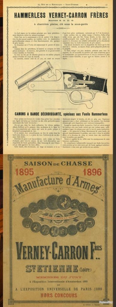Σελίδες από τον κατάλογο 1895 της Verney Carron που δείχνει λεπτομέριες του εσώσφυρου δίκαννου, του Hammerless όπως το αποκαλεί.