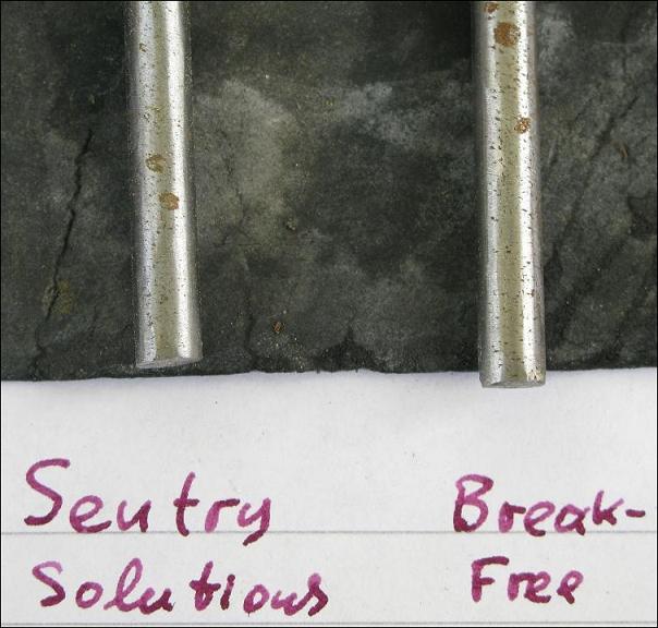 Πριν λίγους μήνες, έκανα το τεστ του ερασιτέχνη. Έκοψα ένα μεγάλο καρφί σε δυό ίσα περίπου τμήματα, τα καθάρισα καλά με καθαρό ασετόν και άπλωσα στο ένα Tuf-Glide και στο άλλο Break Free CLP. Φρόντισα να μην έλθουν σε επαφή μεταξύ τους ή με λερωμένα χέρια κλπ. Ύστερα από δύο εικοσιτετράωρα έβαλα τα καρφιά σε χαρτί κουζίνας με αλατισμένο νερό. Το αποτέλεσμα των φωτογραφιών μετά από τρία εικοσιτετράωρα φαίνεται στη φωτογραφία. Δεν υπάρχει ουσιώδης διαφορά, αλλά παραμένω καχύποπτος με τα μη συμβατικά λιπαντικά. Μη έχοντας επαγγελματική εμπλοκή με τον χώρο του κυνηγίου, ουδόλως επιδιώκω διαφήμιση ή δυσφήμιση κάποιας εταιρείας.