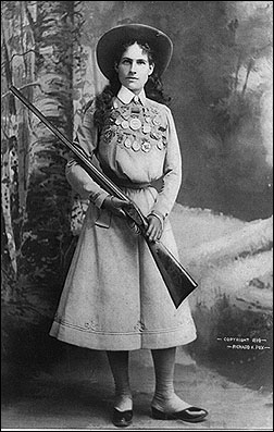 H Annie Oakley ήταν θρυλική προσωπικότητα της Αμερικής στις αρχές του 20ου αιώνα. Ηταν σκοπεύτρια επιδείξεων με αλάθητο μάτι. Σε μια επίδειξη πέτυχε χιλιάδες στόχους, μικρούς ξύλινους κύβους, ρίχνοντας με 22άρι ραβδωτό! Την είχε προσλάβει ο διάσημος Μπούφαλο Μπιλ στον περιοδεύοντα θίασο του που ταξίδεψε τον κόσμο προσφέροντας την Αγρια Δύση ως θέαμα.
