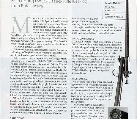 Πρόκειται για το Pack Rifle, το τουφέκι σακιδίου από την εταιρεία Ruta Locura. Το τουφέκι χρησιμοποιεί ως θεμέλιο την βάση του μονόσφαιρού “παιδικού” τουφεκιού Crickett, ενός όπλου με κινητό ουραίο και εξαιρετικά απλής κατασκευής. Η κάννη αλλάζει με μια υπερελαφρυά κάννη με περίβλημα από ανθρακονήματα. Το κοντάκι είναι μια σωλήνα από ανθρακονήματα που σφίγγει πάνω στη βάση με μια βίδα-πεταλούδα.