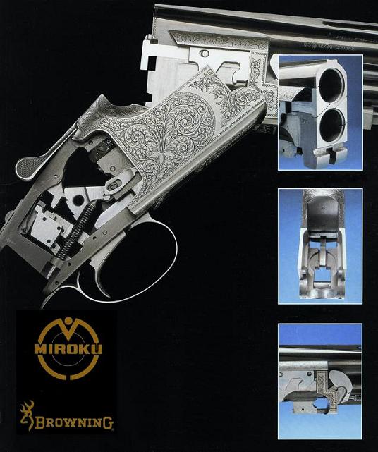 Σελίδα από τον κατάλογο της Miroku όπου φαίνεται και το λογότυπο της Browning, ένδειξη της συγγένειας μεταξύ των δύο όπλων. Προσέξτε τα στοιχεία του όπλου στις φωτογραφίες- την μασσίφ βάση, το συρταρωτό κλειδί, τον πίρο και το ωστήριο όπλισης στην πάπια.