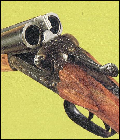 Δίκαννο Merkel με τα χαρακτηριστικά των γερμανικών όπλων: περαστό κλειδί, δείκτες όπλισης και “αυτιά” που κρατούν τις κάννες.