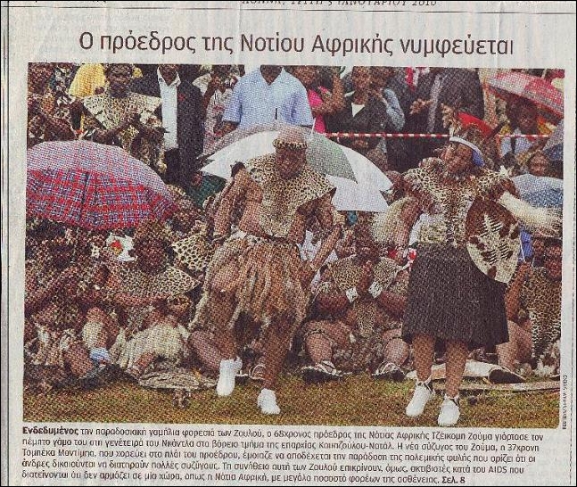 Δείτε την φωτογραφία. Ενας ευτραφής κύριος και μια στρουμπουλή κυρία παντρεύονται και χωρεύουν τους γαμήλιους χορόυς της φυλής τους, και πολύ καλά κάνουν! Είναι ο πρόεδρος της Νοτίου Αφρικής που νυμφέυεται την πέμπτη του σύζυγο.