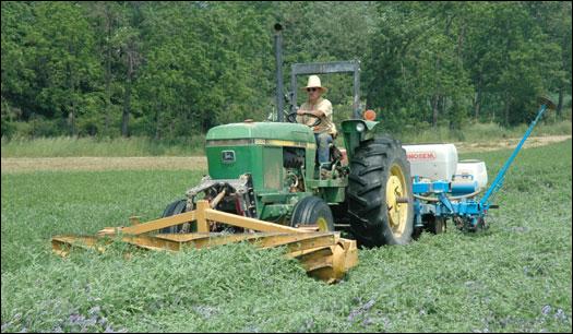 Τρακτέρ με κύλινδρο που τσακίζει και ξαπλώνει τα υπολείμματα σπαρτών, από την εταιρεία Rodale.