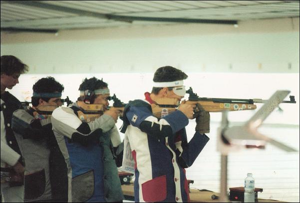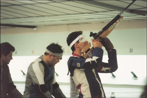 Σκοπευτής σε αγώνα Ολυμπιακού Αεροβόλου στα δέκα μέτρα επωμίζει. Προσέξτε την θέση του αριστερού χεριού κάτω από τον υποφυλακτήρα. Με αυτή τη θέση χεριού τι χρειάζεται η μακριά πάπια;
