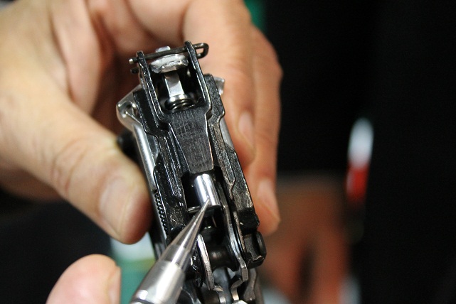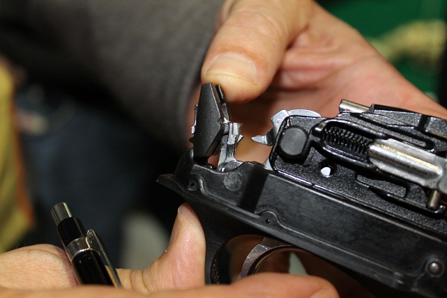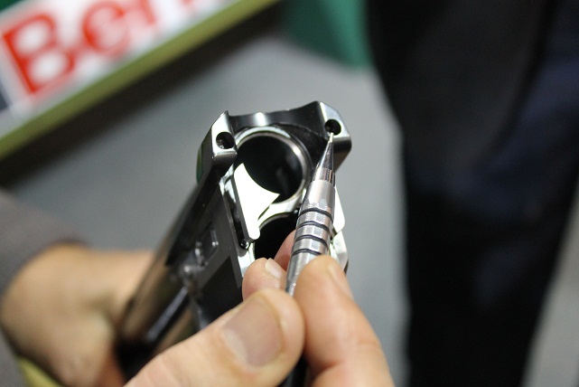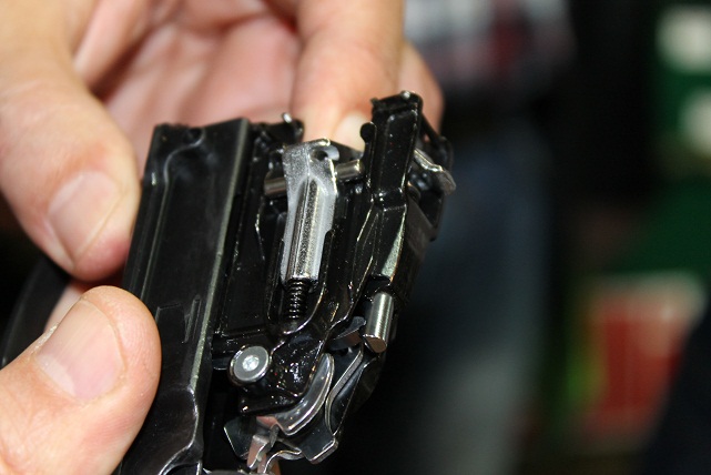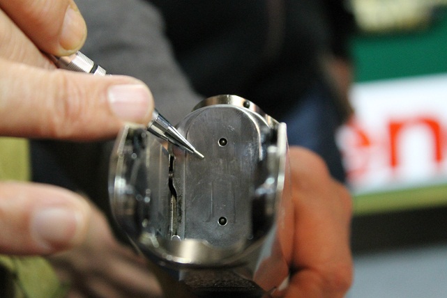 Looking down at the cylindrical tumbler of the upper barrel. The simplicity of the firing system offers a striking contrast to the traditional systems.